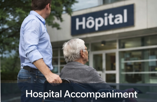 We provide respectful and secure accompaniment for hospital and medical appointments, including assistance during the visit, help with orientation, and safe return home (transport or accompaniment according to your arrangement).
